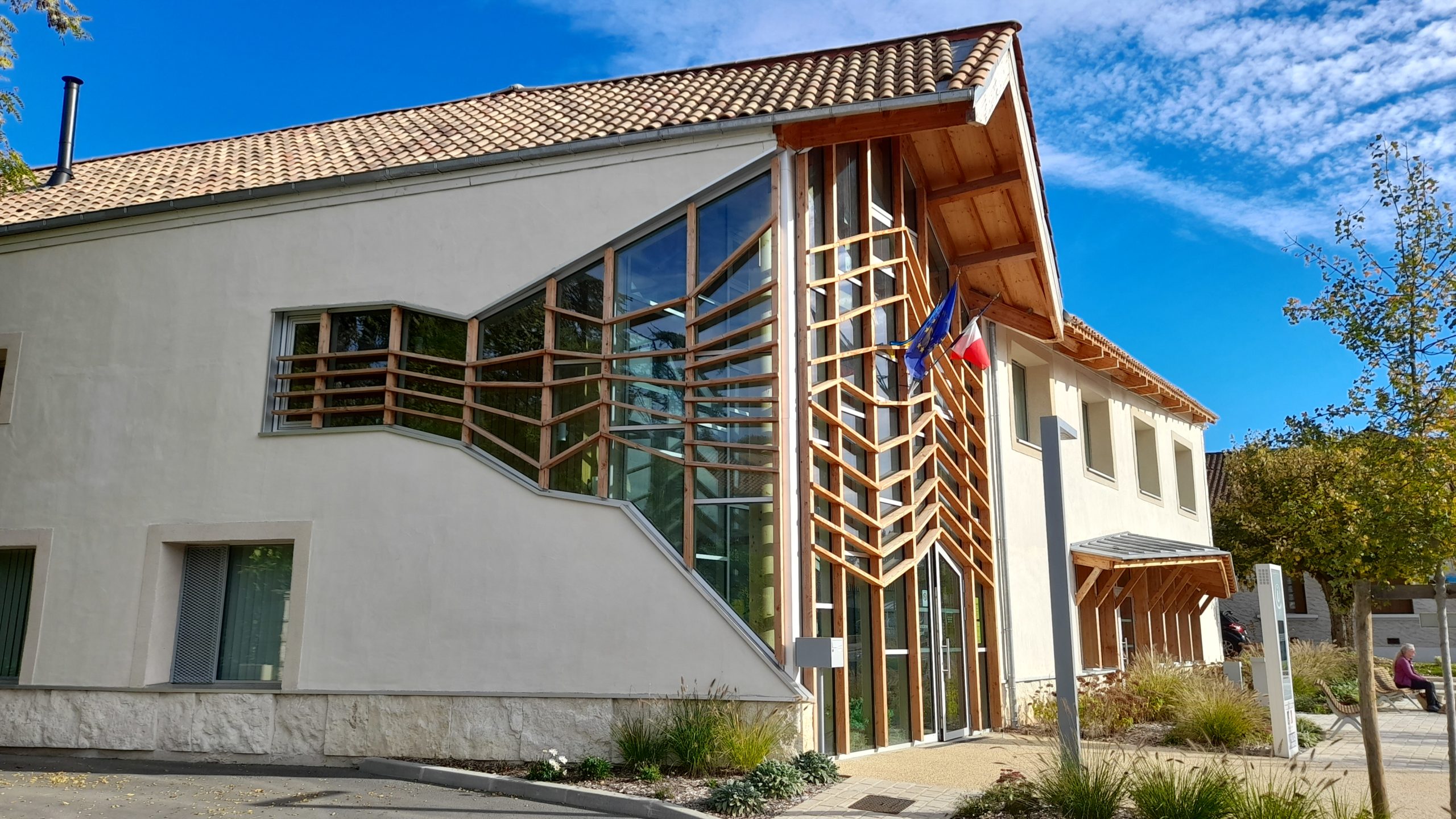 Niveau E3C2 / Construction en bois, isolation en paille, apport d’inertie en terre crue, refends en pierre massive isolés en béton de chanvre / Confort d’été passif / Chaufferie biomasse
